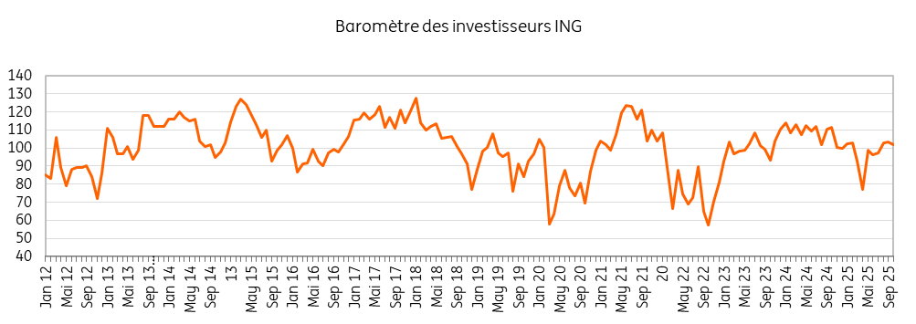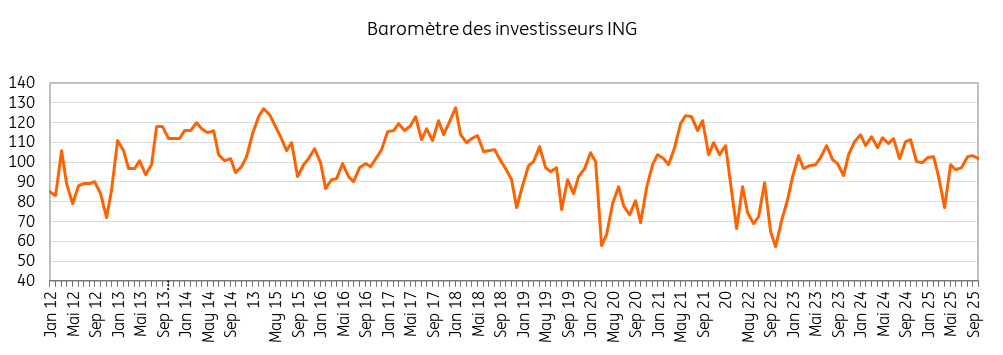 Le baromètre ING des investisseurs a légèrement baissé à 102 points en octobre, après avoir atteint 104 points en septembre. Cela maintient le baromètre au-dessus de son niveau neutre de 100 points pour le troisième mois consécutif, ce qui indique que les investisseurs belges considèrent que l'environnement financier et économique évolue favorablement.