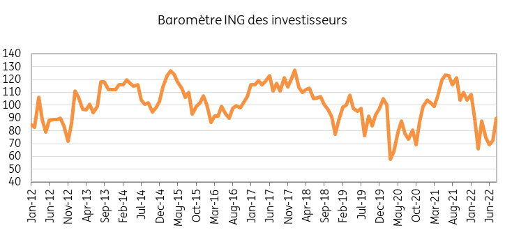 Le baromètre ING des investisseurs a poursuivi sa progression en août, atteignant 90 points après avoir atteint 72 points en juillet. Malgré cette évolution positive, le baromètre reste inférieur à 100, ce qui indique une humeur plutôt pessimiste chez les investisseurs belges. Cette situation perdure depuis février. Seuls 24% des investisseurs voient les perspectives économiques s'éclaircir au cours des trois prochains mois, tandis que 48% anticipent une détérioration du climat économique. Par ailleurs, bien que les perspectives boursières soient légèrement moins négatives qu'en juillet, l’état d’esprit reste plutôt pessimiste : 36% des répondants s'attendent à une baisse des cours des actions dans les mois à venir, tandis que 28% misent sur un rebond. Dans ce contexte, il est surprenant que 35% des investisseurs prévoient que leurs investissements augmenter en valeur dans les mois à venir et que seulement 24% s'attendent à une diminution de la valeur de leur portefeuille.