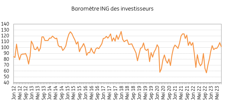 Le baromètre ING des investisseurs a fait un pas en arrière en août, tombant à 102 points, après 109 points en juillet. Néanmoins, le baromètre reste au-dessus du niveau neutre de 100 points, ce qui indique que les investisseurs belges jugent toujours les développements économico-financiers plutôt favorablement.