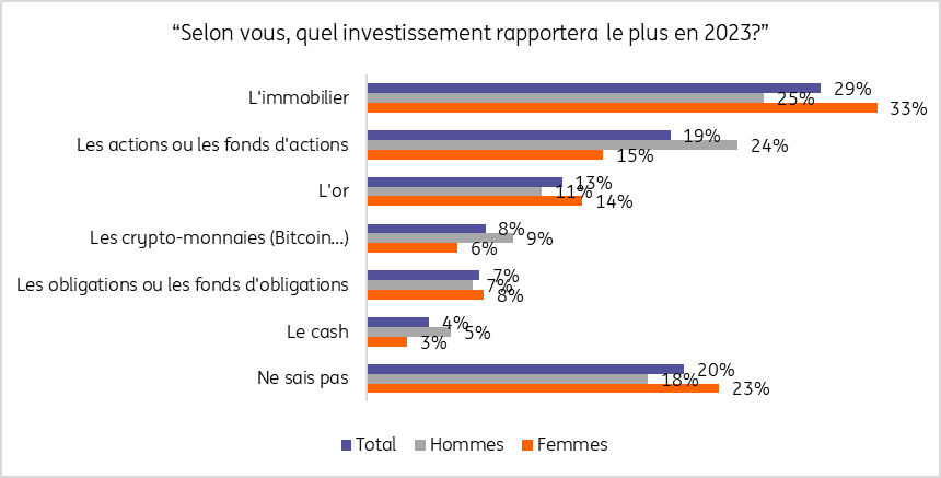 Interrogés sur ce qu'ils pensent être le meilleur investissement en 2023, 29% des répondants choisissent l'immobilier. L'immobilier occupait également la première place l'année dernière. Pour 19%, les actions ou les fonds d'actions seront le meilleur investissement, tandis que 13% voient l'or comme le meilleur investissement de l'année. Les crypto-monnaies figurent en tête des meilleurs investissements pour seulement 8% des investisseurs. Et malgré des taux d'intérêt à long terme beaucoup plus élevés, à peine 7% des investisseurs placent les obligations ou les fonds obligataires en tête de la liste des meilleurs investissements. Le fait qu'un cinquième des investisseurs n'ose pas se prononcer sur le meilleur investissement potentiel de 2023 montre que l'incertitude est grande. Enfin, alors que chez les hommes, l'immobilier et les actions obtiennent des résultats équivalents, avec chacun environ un quart des votes, parmi les investisseurs féminins, l'immobilier (33%) se distingue nettement plus que les actions (15%) comme meilleur investissement. "C'est un phénomène récurrent. Les investisseurs féminins ont tendance à opter pour une plus grande sécurité. Et sur ce plan, l'immobilier est considéré comme plus sûr que les actions", déclare Peter Vanden Houte.