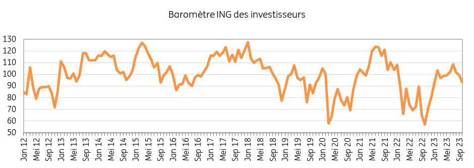 Le baromètre ING des investisseurs a encore baissé à 93 points en octobre, le niveau le plus bas depuis le début de l'année et bien en dessous du niveau neutre de 100 points. Les investisseurs belges considèrent donc de moins en moins favorablement l'environnement économico-financier. Le pourcentage d'investisseurs qui ont vu la situation économique se détériorer au cours des trois derniers mois est passé à 43%, tandis que seuls 22% ont constaté une amélioration. Il est intéressant de noter que les néerlandophones sont plus nombreux (47%) que les francophones (39%) à considérer que la situation économique est en train de s'affaiblir.
