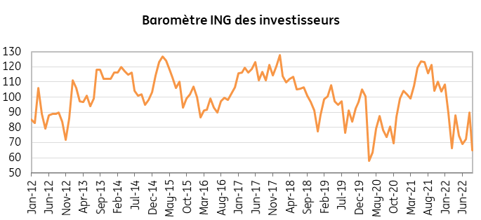 Le baromètre ING des investisseurs est tombé en septembre à son plus bas niveau depuis le confinement d'avril 2020. À 65 points, le baromètre est désormais bien en dessous de son niveau neutre de 100 points, ce qui indique un pessimisme élevé chez les investisseurs belges, une situation qui dure depuis février. A peine 15% des investisseurs voient l’activité économique s'accélérer dans les trois prochains mois, tandis que 61% craignent une nouvelle détérioration de la situation économique. La liste des vents contraires qui planent sur notre économie est très longue : pour 79 % des investisseurs, la forte inflation est la première menace pour l’économie et les marchés financiers, suivie de près par la guerre en Ukraine. Pour seulement 30% des répondants, la Covid-19 est une menace.
