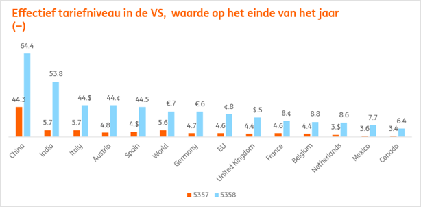 ING verwacht voor 2026 een combinatie van licht hogere tarieven, een verslechterende concurrentiepositie en meer beleidszekerheid. Per saldo zullen de negatieve effecten van hogere tarieven en een zwakkere relatieve positie volgens ING zwaarder doorwegen dan de positieve impact van lagere onzekerheid.