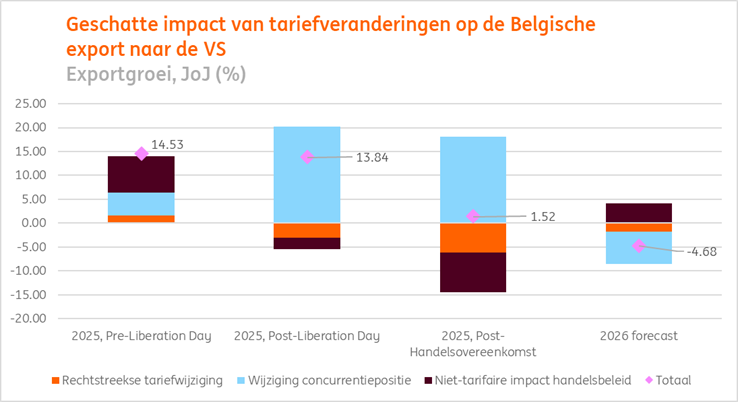 Een econometrische analyse van ING verzoent het ogenschijnlijk stabiele exportmarktaandeel met de negatieve impact van Amerikaanse tarieven. De analyse onderscheidt drie kanalen waarlangs het Amerikaanse handelsbeleid de Belgische export beïnvloedde: (i) een rechtstreekse tariefimpact, (ii) veranderingen in de relatieve concurrentiepositie en (iii) niet‑tarifaire effecten, zoals beleidsonzekerheid en extra administratieve lasten.