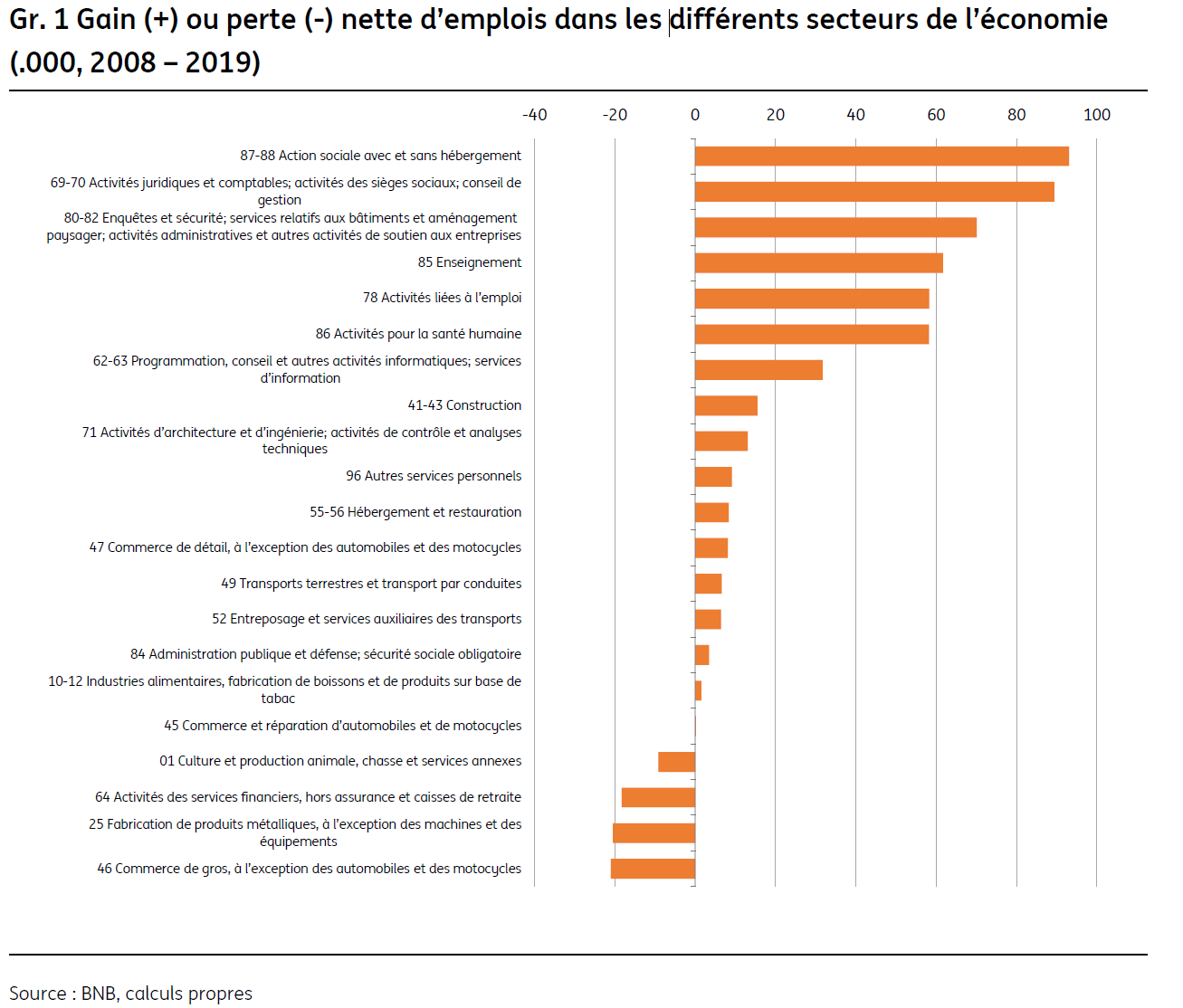 Entre 2008 et 2019, quelques 610.000 emplois ont été créés en Belgique, soit une création nette de 422.000 emplois sur cette période si l’on tient compte des 188.000 emplois disparus. On note cependant un glissement dans la structure sectorielle de l’emploi. Comme on le voit dans le graphique 1, le secteur de l’action sociale a créé plus de 90.000 emplois. Le secteur des « activités juridiques et comptables, de sièges sociaux et de conseil en gestion » ainsi qu’un pan assez large de services divers aux entreprises (sécurité, gestion des bâtiments, aménagement paysager, activités administratives et soutien aux entreprises) ont créé respectivement 89.400 et 70.100 emplois pendant la même période. Trois autres secteurs ont chacun généré environ 60.000 emplois. Il s’agit de l’enseignement, des activités liées à l’emploi (comme le travail intérimaire), et le secteur de la santé humaine (hôpitaux, médecins, dentistes, laboratoires d’analyse …). Ensemble, ces 6 secteurs, qui représentaient 39% de l’emploi total en Belgique en 2019, ont permis de créer plus de 430.000 emplois.