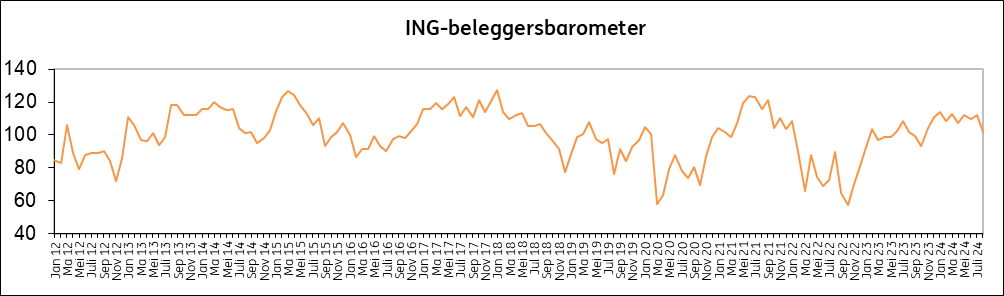 De ING-beleggersbarometer daalt in augustus van 112 punten naar 102 punten, nog net boven het neutrale niveau van 100 punten. De Belgische belegger begint zich toch wat zorgen te maken over de conjunctuur. Zo zag amper 19% een verbetering van de economische situatie in de voorbije drie maanden, terwijl 39% van een verslechtering sprak.