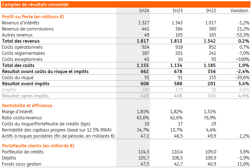ING Belgique a continué à jouer pleinement son rôle de prêteur dans l'économie belge au cours du premier semestre 2024. Grâce à d'importants octrois de crédit aux entreprises, notre portefeuille de prêts a connu une croissance de quelques 4 milliards d’euros pour atteindre 114,5 milliard d'euros. La baisse des dépôts des clients a été plus que compensée par la forte croissance des produits d'investissement. Cette dynamique commerciale positive permet de clôturer le premier semestre 2024 avec un solide résultat avant impôts de 608 millions d'euros, soit 28 millions d'euros de plus par rapport à la même période de l'année précédente.