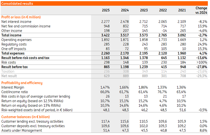 ING Belgium ended the 2025 financial year with a pre-tax profit of €865 million. This profitability is sustained thanks to a strong commercial activity, which pushed the fee income generating activities to record high levels. The decrease in pre-tax profit, compared to 2024, is mostly attributable to (1) reduced interest rate revenues in ING Luxembourg and the broader lower rate environment, (2) a significant rise in bank levies and (3) an increase in risk costs situated in the international part of our Wholesale Banking activities.