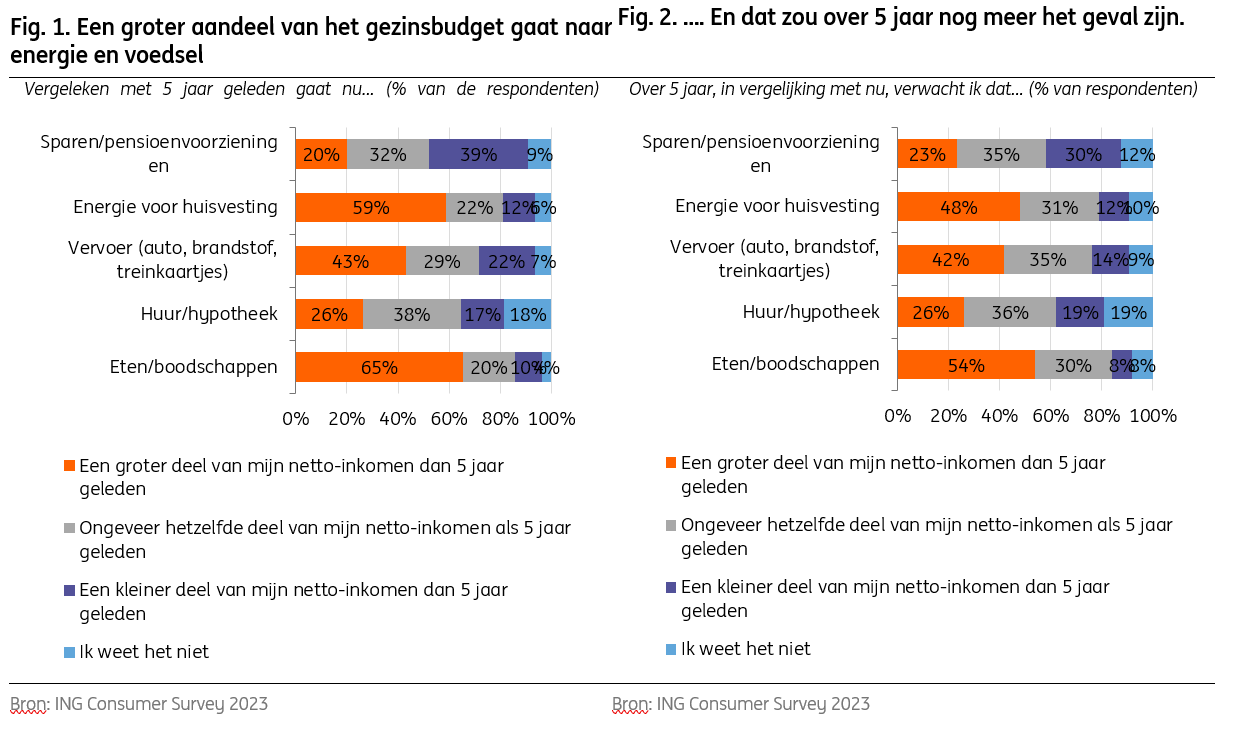 Brussel - De energie-inflatie in 2022 en de voedselinflatie in 2023 lijken een sterke impact te hebben op consumenten. 65% van de Belgen is van mening dat ze momenteel een groter deel van hun inkomen besteden aan boodschappen voor voeding dan vijf jaar geleden. Bijna zes op de tien zegt een groter deel van hun inkomen te besteden aan energiefacturen. Dit soort uitgaven neemt een groter deel van het huishoudbudget in beslag, ten koste van besparingen. Bijna vier op de tien mensen zeggen zelfs dat ze minder hebben gespaard. De impact van de huidige economische situatie op de manier waarop Belgen consumeren en hun financiën beheren is niet te verwaarlozen. De conclusie van het ING-consumentenonderzoek1, geschreven door Charlotte de Montpellier, senior econoom bij ING België, is duidelijk: na de verschillende economische schokken van de afgelopen jaren verkeert de bevolking in een mist en kan ze zich moeilijk voorstellen wat het 'nieuwe normaal' zal zijn.