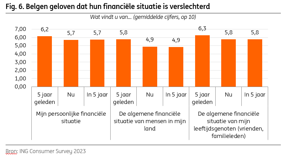 Een moeilijke economische situatie betekent dat mensen een dubbelzinnige perceptie hebben van hun eigen financiële gezondheid en die van anderen. Gemiddeld geven de Belgen hun persoonlijke financiële situatie een score van 5,7. Volgens de respondenten is hun persoonlijke situatie dus verslechterd in vijf jaar tijd (toen 6,2). Interessant is dat ze vinden dat hun eigen financiële situatie beter is dan die van de bevolking als geheel. Ze vinden echter dat de financiële situatie van hun vrienden iets beter is dan die van henzelf. Uit de enquête blijkt ook dat 55% van de Belgen zegt dat ze momenteel minder sparen omwille van de inflatie. Voor de meesten van hen stelt de inflatie hen niet langer in staat om te sparen zoals vroeger. 8% van de Belgen consumeert echter liever nu dan later omdat ze dan meer voor hun geld krijgen. Tot slot zegt bijna een op de vijf consumenten dat ze hun spaargewoonten niet veranderen.