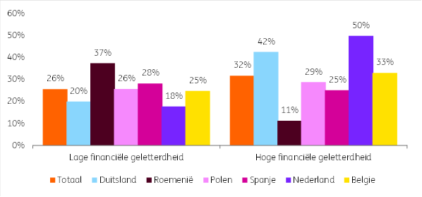 - Nederland (50%) en Duitsland (42%) tellen aanzienlijk meer inwoners met een hoge financiële kennis, tegenover 33% in België.