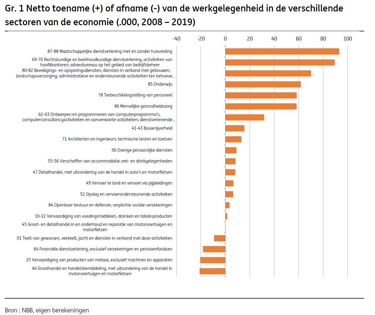 Van 2008 tot 2019 werden in België netto 422.000 jobs gecreëerd (610.000 min 188.000). Er valt echter een sectorale verschuiving op (grafiek 1). De sector van de maatschappelijke dienstverlening heeft meer dan 90.000 jobs gecreëerd. In de vrij brede sector met zakelijke diensten aan ondernemingen (rechtskundige en boekhoudkundige dienstverlening, hoofdkantoren en adviesbureaus op het gebied van bedrijfsbeheer) en de sector die voornamelijk actief is in beveiliging en beheer van gebouwen (beveiligings- en opsporingsdiensten, diensten ivm gebouwen en landschapsverzorging) zijn er in dezelfde periode respectievelijk 89.400 en 70.100 jobs bijgekomen. Drie andere sectoren, met name onderwijs, gezondheidszorg en de uitzendsector (terbeschikkingstelling van personeel), zorgden elk voor ongeveer 60.000 jobs. Samen hebben deze zes sectoren, die in 2019 goed waren voor 39% van de totale werkgelegenheid in België, meer dan 430.000 banen gecreëerd.
