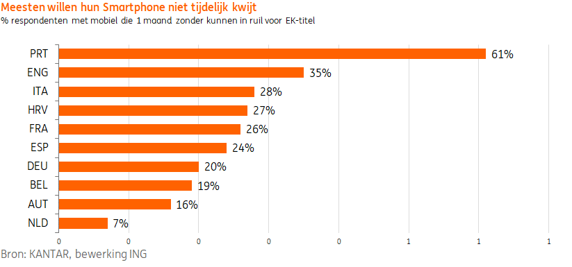 Gezien de inkomensverschillen tussen de landen en de respondenten geeft een geldbedrag mogelijk een vertekend beeld van de mate waarin supporters iets willen opofferen om hun ploeg te zien winnen. Vandaar dat in de enquête ook werd gepolst of supporters een maand zonder smartphone zouden kunnen leven in ruil voor de Europese kampioenstitel. Maar ook hier tonen zowel de Belgen als de Nederlanders zich weinig fanatiek. Slechts één Belg op de vijf (19%) geeft aan zijn smartphone een maand te willen missen als dat de Rode Duivels aan tornooiwinst zou helpen. Bij de Nederlandstaligen gaat het om 20%, bij de Franstaligen om 17%.