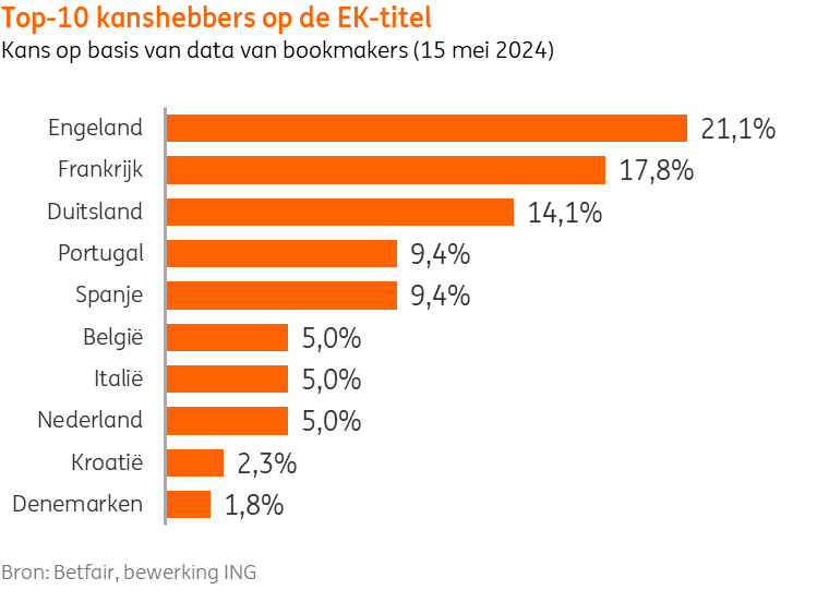 Volgens de bookmakers is Engeland de topfavoriet om de beker mee naar huis te nemen, terwijl Frankrijk op de tweede plaats komt en thuisland Duitsland de top drie van de kanshebbers vervolledigt. Volgens de ondervraagde Belgische voetballiefhebbers is Frankrijk echter de grootste kanshebber om zich Europees kampioen te kronen (19%), terwijl 13% van de respondenten op België mikt. Evenveel respondenten tippen Duitsland (13%) als eindwinnaar. Amper 1 op 10 Belgen ziet in Engeland een mogelijke winnaar.