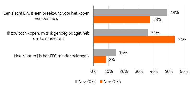 Brussel - Uit een enquête van ING België1 blijkt dat steeds meer gezinnen openstaan voor de aankoop van een renovatiewoning dan een jaar geleden. Terwijl een jaar geleden 49% van de ondervraagden zei dat een slechte EPC-score een breekpunt was bij de aankoop van een huis, is dat vandaag slechts 38%. Verder blijkt uit het onderzoek dat bijna 9 op de 10 Belgen niet geloven dat we de klimaatdoelstellingen voor vastgoed zullen halen, die vereisen dat ons hele gebouwenbestand klimaatneutraal is tegen 2050. Sterker nog: bijna driekwart is niet eens op de hoogte dat álle woningen tegen 2050 aan deze energiedoelstelling moet voldoen, wat betekent dat veel kopers het belang van energie-efficiëntie nog steeds onderschatten. Tot slot lijkt het weinig waarschijnlijk dat we in 2024 een sterke opleving van de vastgoedmarkt zullen zien. Hoewel de rente de afgelopen weken iets is gedaald, blijft de betaalbaarheid van vastgoed nog steeds slechter in vergelijking met de periode voor 2022.
